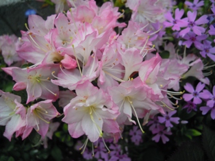 傍には芝桜、絨毯のようには育ちませんが、かろうじて咲きます。