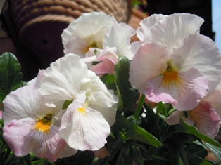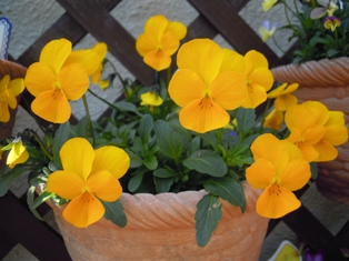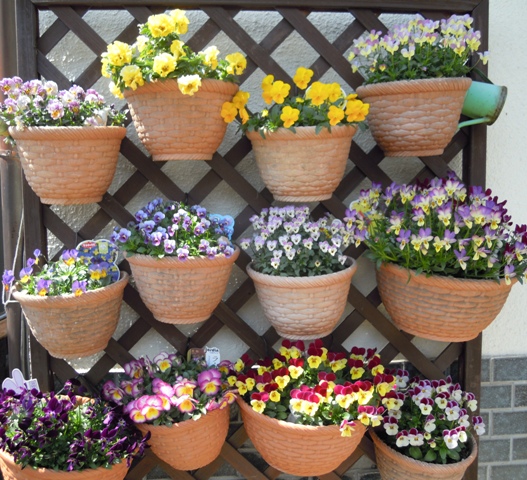 ラティスに掛けたパンジーとビオラがいっぱい咲いてくれるようになりました。