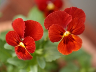 タキイ交配ビオラ、F1ビビ スカーレット(赤)、F1ビビ トリコロール レインボージュエル(3色ミックス)