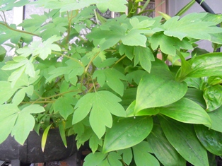 鉢植えで葉っぱばかり茂って咲かなかったタイツリソウ、その隣には、これから咲くかもしれないホトトギス ↓ 置き場もないので棚に置いておきました。その後ろ ↓