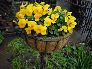 右上のいつも青空と登場する黄色いビオラは、ポールで立てて目立ちやすいように…