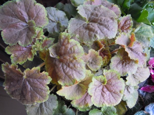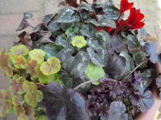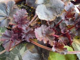 寄せ植えしたヒューケラ・オブシディアン ツボサンゴ・ミラクル