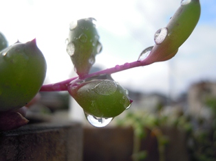 朝一番に眺めたお花は、水滴が陽射しで一瞬輝きました。