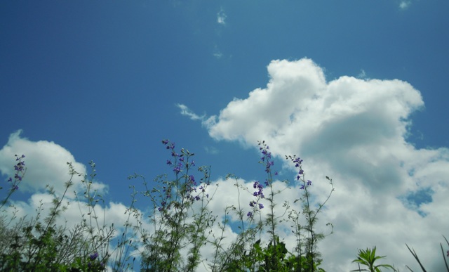 散歩途中に空を見上げると、青い空はとても美しく、お花が風に揺れていました。