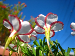 うつむいて咲くクレマチスは、雪をかぶって寒さに震えているようでしたが、青空をバックにすると元気そうに見えてきました。
