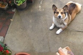 さすけは朝の散歩が終わると、下をセメントで固められた場所に繋がれるのですが、物置にしているこの場所は下が土なのでなかなかここから家に帰ろうとしません。