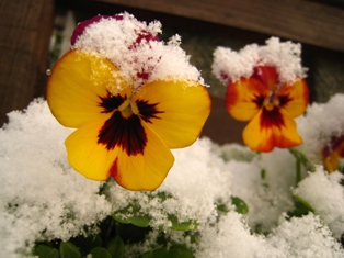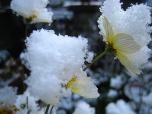 庭の花たちはどうしているかなと朝見てみると、ウインターコスモスも、ビオラにも雪、雪、雪~。