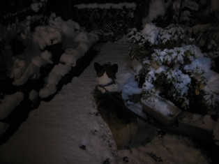 夫と私と一匹の真夜中の散歩、外は雪明り、街灯だけで懐中電灯がいらないほどでした。