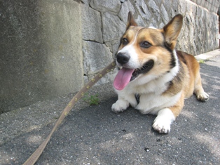 そして、さすけ、朝の散歩から帰って陰に入って伸びています。
