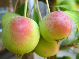 右のクラブアップル ゴージャスは、実つきで6月にお迎えしたものですが、朝晩涼しくなったのか、2cmくらいの実が少し色づいてきました。