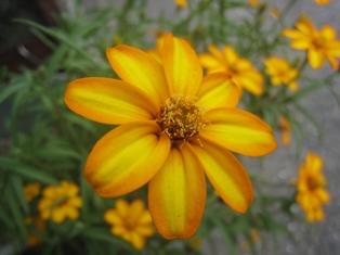 家の前には、ジニア・プロフュージョンとポーチュラカのプランター、この裏に背の高いひまわり…