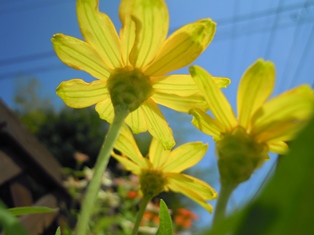 こんなに可愛く咲いていたミニヒマワリ → 今はこんな花形に咲いています。