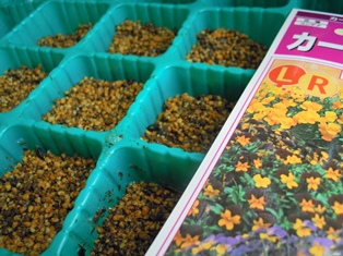 道路側に置いたプランターには毎夏、ジニア・リネアリスの黄色かオレンジを植えているのですが、今年は苗の出回る時期に買いに行けなかったので、ミニヒマワリの種を蒔きました。