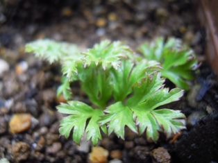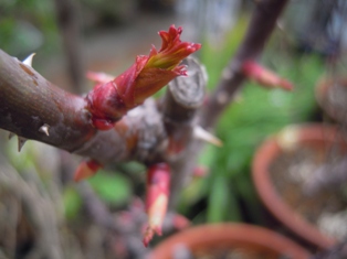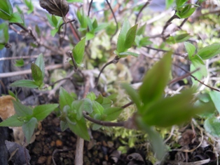 ミニバラは、もう葉が展開し始めました。春の楽しみ、日本さくら草の芽 ↓ が出始めました。