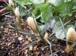 葉っぱは伸び放題、隣には何の球根を植えたのか、押され気味です。