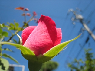 今日もきれいな青空、空を見上げると、鳩が電線にとまっていました。バラ ブライダルピンク、淡いピンクのはずが、この枝はまた濃いピンクが咲きそうです。