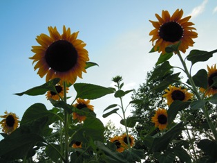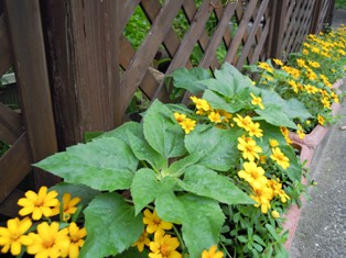 外側では、ジニア・リネアリスを押し広げるように、ミニひまわりが大きくなってきました。(右下)