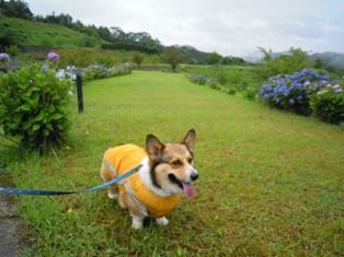 雨でもさすけと一緒、車の中ばかりでは可哀想と、アジサイ咲く道を歩いてみました。