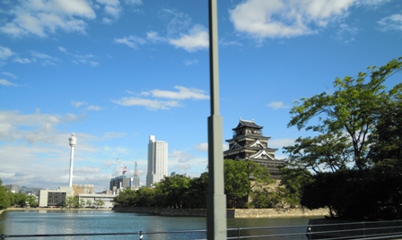 車の中から、広島城を撮ってみました。シャッターチャンスは一瞬、遅すぎてポールが真ん中にきてしまいました。失敗です。嵐のような雨の後の青空を見てください。