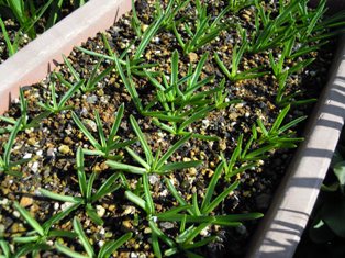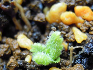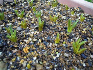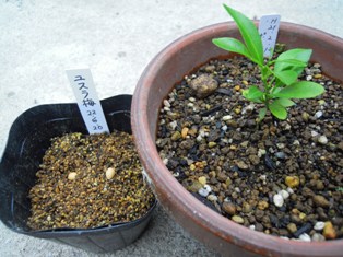 右は、昨年2月に蒔いたポンカンの芽、管理が悪く、まだ5cm、どんな先祖返りになるのか楽しみです。まだまだ、ず~~~と先ですね。