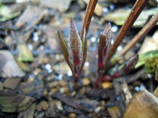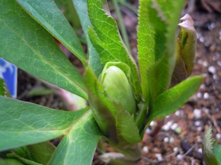 右下の八重咲きのクリスマスローズは昨年小さな苗を買ったものですが、今年はまだ咲かないのかな?と思いながらも気になる芽…