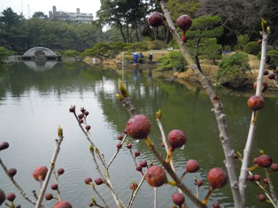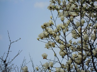県立美術館側の開花が早いです。写真を撮ろうとしても、コンデジを上に向けては、上手く撮れませんでした。開花は上の方、今日は用があって夫も一緒、私を持ち上げてもらって写真を撮ろうとしたら、重すぎて持ち上がらないそうです。(笑) 人に見られたら笑われてしまいますね。