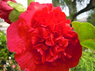 昨日蕾だった八重咲きタチアオイの一番花が咲きました。