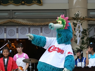 広島バトンジュニアと崖の上のポニョ、ゆっぴーも手拍子。右上はカープ球団のマスコット、スラィリーと“カープ カープ カープ広島 広島カープ~”