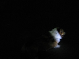 すごく暗く見えるけど午後5時過ぎです。薄暗くなるとシャッタースピードも遅くなるし、写真も撮りにくくなります。懐中電灯をあてて撮ってみました。首から胸の白い毛だけはよく目立ちます。