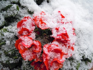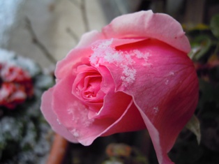 軒下に置いたプリムラ・ポリアンサの鉢にも、バラ プリンセス・ドゥ・モナコにも雪~