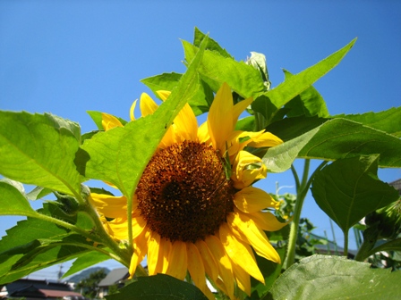 近所の畑では向日葵、青空の下では、輝いて見えますね。黄、緑、青… きれい~ でしょ。