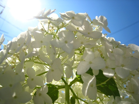 アジサイ アナベルから空を見上げてみました。やさしいブルーと白…