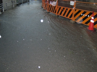 国道傍の溝は狭いからすぐ溢れるのよね~ と、思って2階のベランダから見ると、家の前の道路が溢れてる。