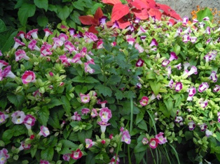 近年、トレニアは、ほふく性の値段も少し高めのものばかり買っていましたが、改めて、この直立する安いものの良さがわかりました。切り戻すとすぐ花芽があがってくるし、株が大きくなって横に張ると、勝手に地面についた茎から根が出てくるようです。挿し木しなくても根を伸ばしてきたものを切って、植えれば、早く失敗なく増やせることがわかりました。来年からは、安いのを買おうっと!