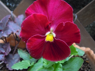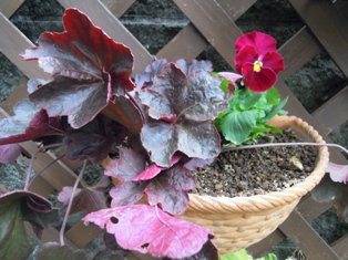 ヒューケラ オブシディアンと一緒に植えたのは、気まぐれ天使(色変わりパンジー)