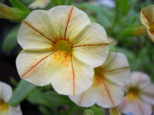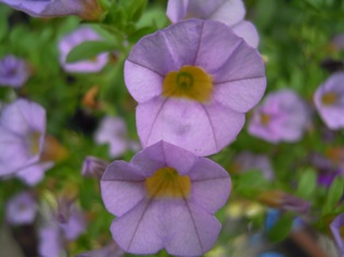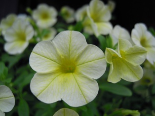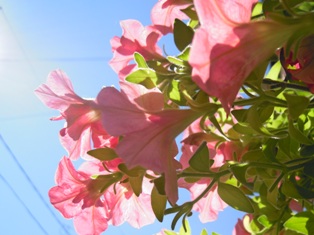 ラティスのペチュニアとカリブラコア、まあまあ咲いているとは思いますが、写真でうまく表現できません。下から青空に向けて撮ってみました。
