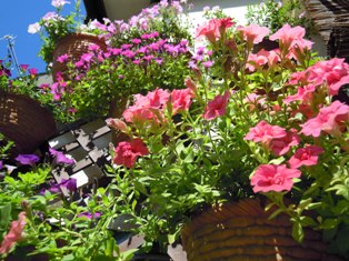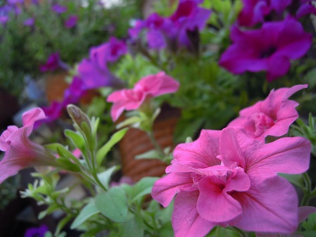 猛暑を乗り越えたペチュニア、サフィニアとドレスアップです。暑い割には、まあまあ咲いてくれました。