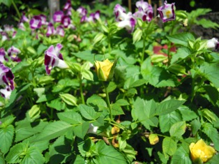 存在に気づいてなかったミニバラの黄、いつのまにか蕾が… 傍のトレニアは今朝はしっかり咲いていましたが、昼にはグッタリ、高温に強いはずが、この暑さは普通じゃありませんね。(右上)