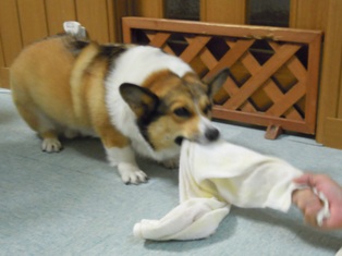 さすけは、家ではタオル引張りっこ、歯形のついたお茶碗(持ってくる)で、ご飯「待て!」