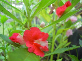 昨年、種をもらったお花が(左下)が咲き始めました。初めて見るお花、つる性です。