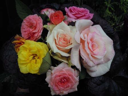 バラは、ポリアンサローズ ファザーズデイが、コロコロっとしたお花を咲かせています。(左下)