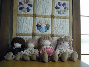 人形は濃いピンクの洋服を着ているのは、先生にほとんど作っていてだいたもの、やっぱり目の位置とかよくてカワイイ! 2回習いに行って、作り方も忘れてしまって、後は自己流になったけど…。洋服も薄汚れてきて、可哀想。