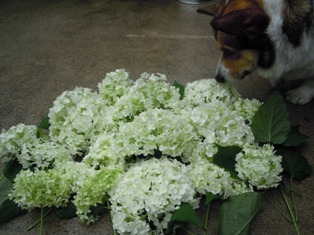 せっかく咲いていたアジサイ アナベル、昨晩から朝の雨で、お花が雨を受けてその重さに耐え切れず、ロープで支えていたけど14本折れてしまいました。