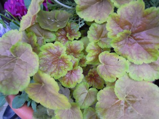 ガーデンシクラメンの傍には、黒っぽいヒューケラ オブシディアン 丸っこい葉っぱがいいなあ~