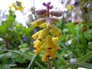 植えっぱなしのムスカリと、今年芽だし球根を買ったムスカリ ゴールデンフレグランス(右下)は、咲き進むと黄色になるのかな?今度は球根を買ってたくさん咲かせてみたい、そんなちょっと気になる色です。