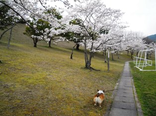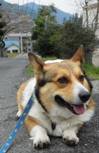 さすけの朝の散歩、途中で休憩、後ろの方ではソメイヨシノ、今三分咲きくらいかしら?