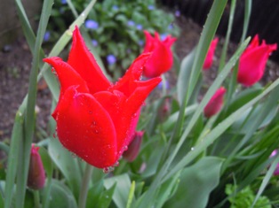 プランターに植えたチューリップ、今年はシンプルでチューリップらしいものをと、ミックスを植えました。2番目に咲いたのは赤いチューリップでした。