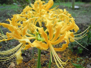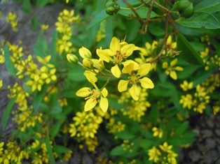 数年前に鉢植えでお迎えして、親株はうまく育たなかったのですが、挿し木で数本植えています。今日の青い空の下では、黄色が眩しく、とても目立つ色です。