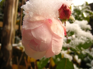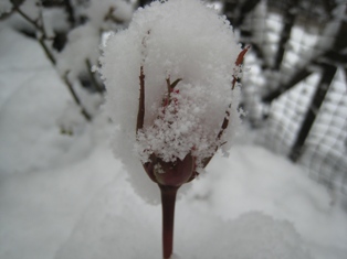 ミニバラ粉粧楼も、私が楽しみにしている挿し木のバラの蕾にも雪~ これからの寒さ、開花できるまで頑張ってくれるでしょうか?