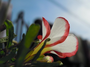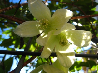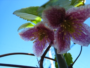 うつむいて咲くクレマチスは、雪をかぶって寒さに震えているようでしたが、青空をバックにすると元気そうに見えてきました。